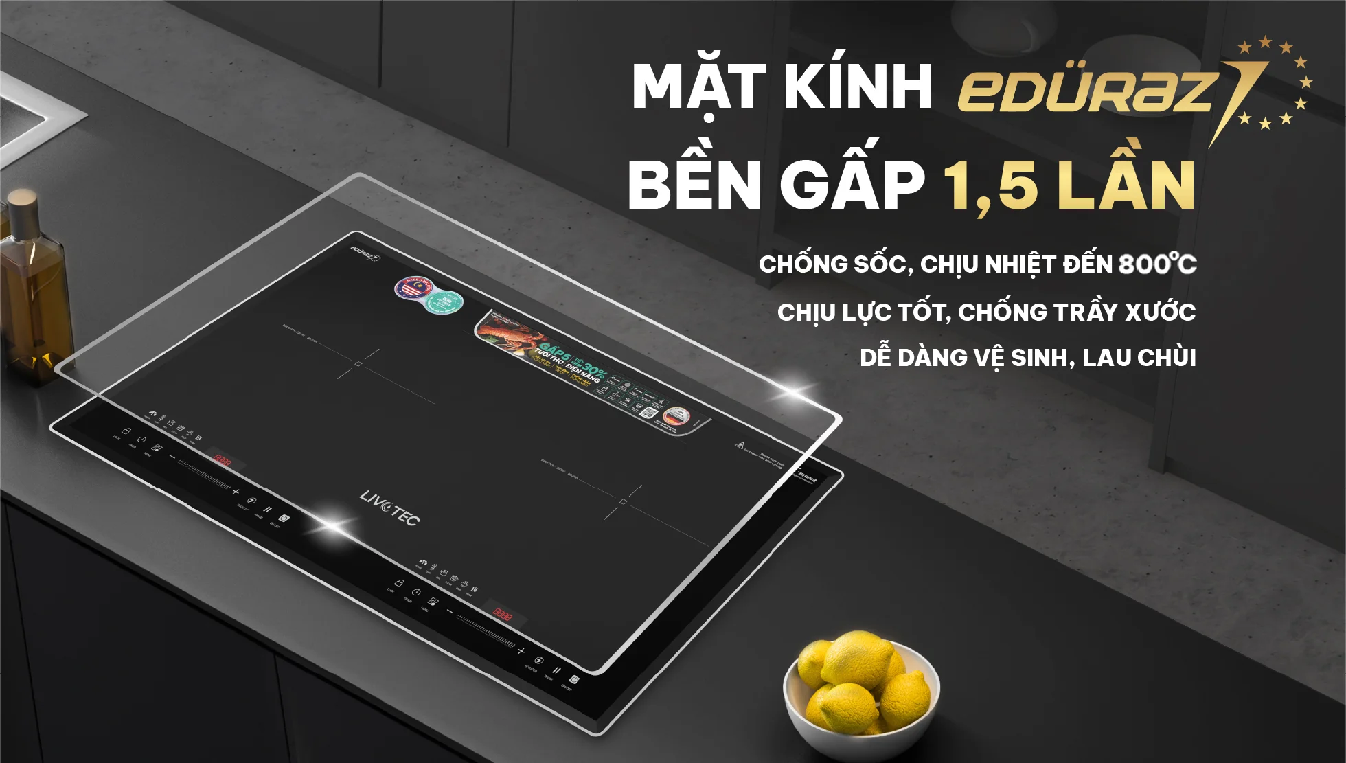 - Mặt kính Eduraz bền gấp 1.5 lần: Mặt kính chịu nhiệt lên tới 800℃, chống trầy xước