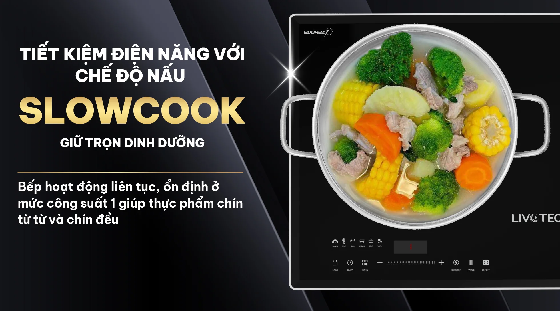 - Chế độ nấu liu riu: Duy trì mức nhiệt thấp ổn định, giữ trọn dinh dưỡng, tiết kiệm điện
