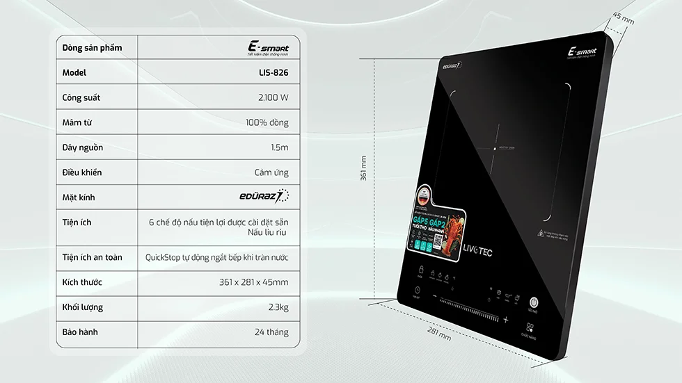 - Nấu nhanh gấp 2 lần: mâm từ E-smart đường kính lớn, truyền nhiệt nhanh đều + công suất 2100W