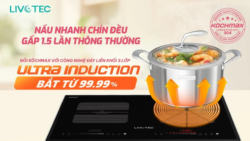 - Công nghệ đáy liền khối Ultra Induction – Bắt từ nhạy, truyền nhiệt nhanh 99.9%, nấu nhanh chín đều gấp 1.5 lần so với nồi thông thường.