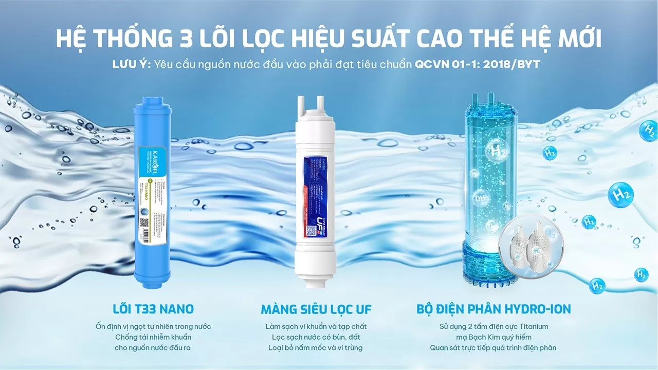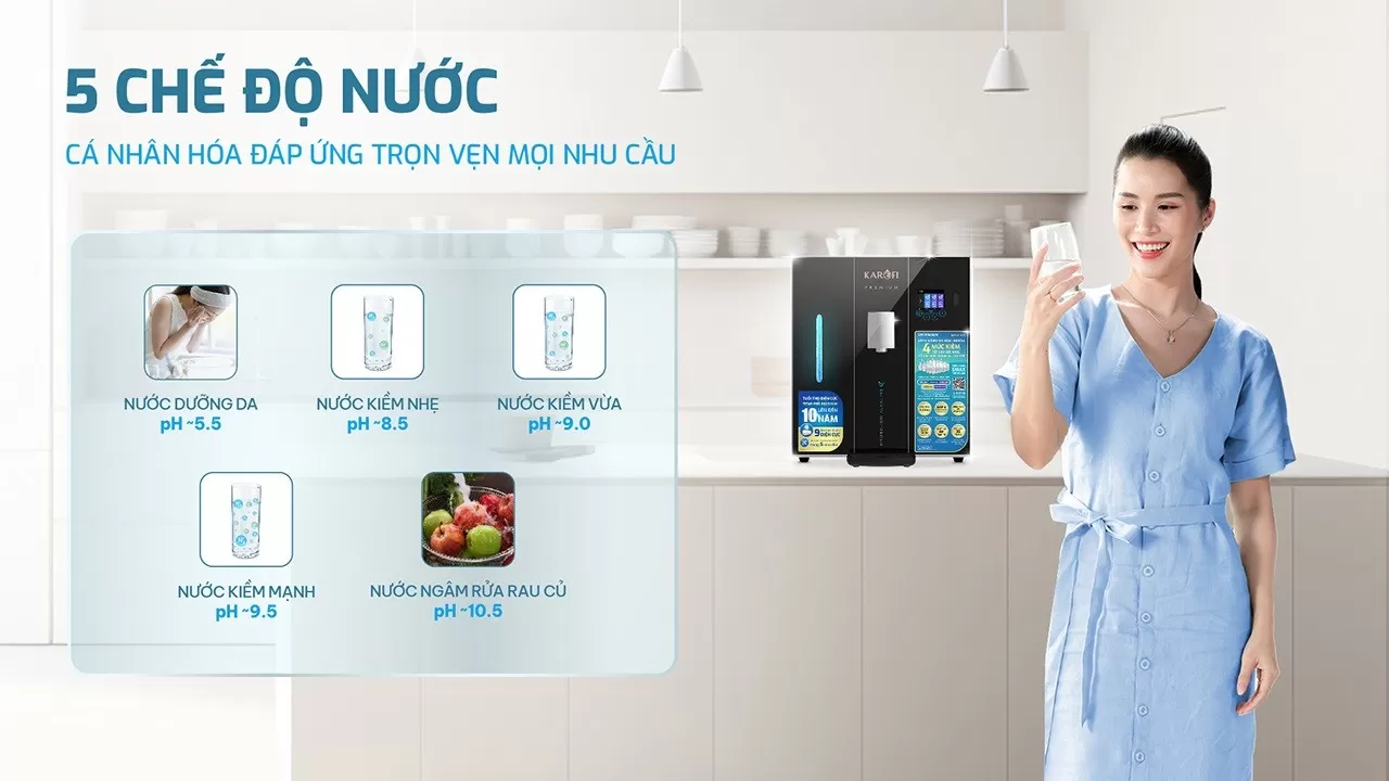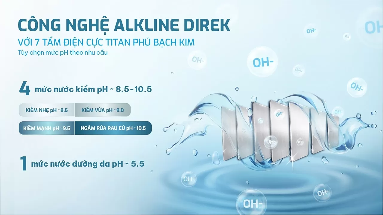 - Công nghệ điện phân Alkaline Direk - Tùy chọn 4 mức kiềm, 1 mức axit