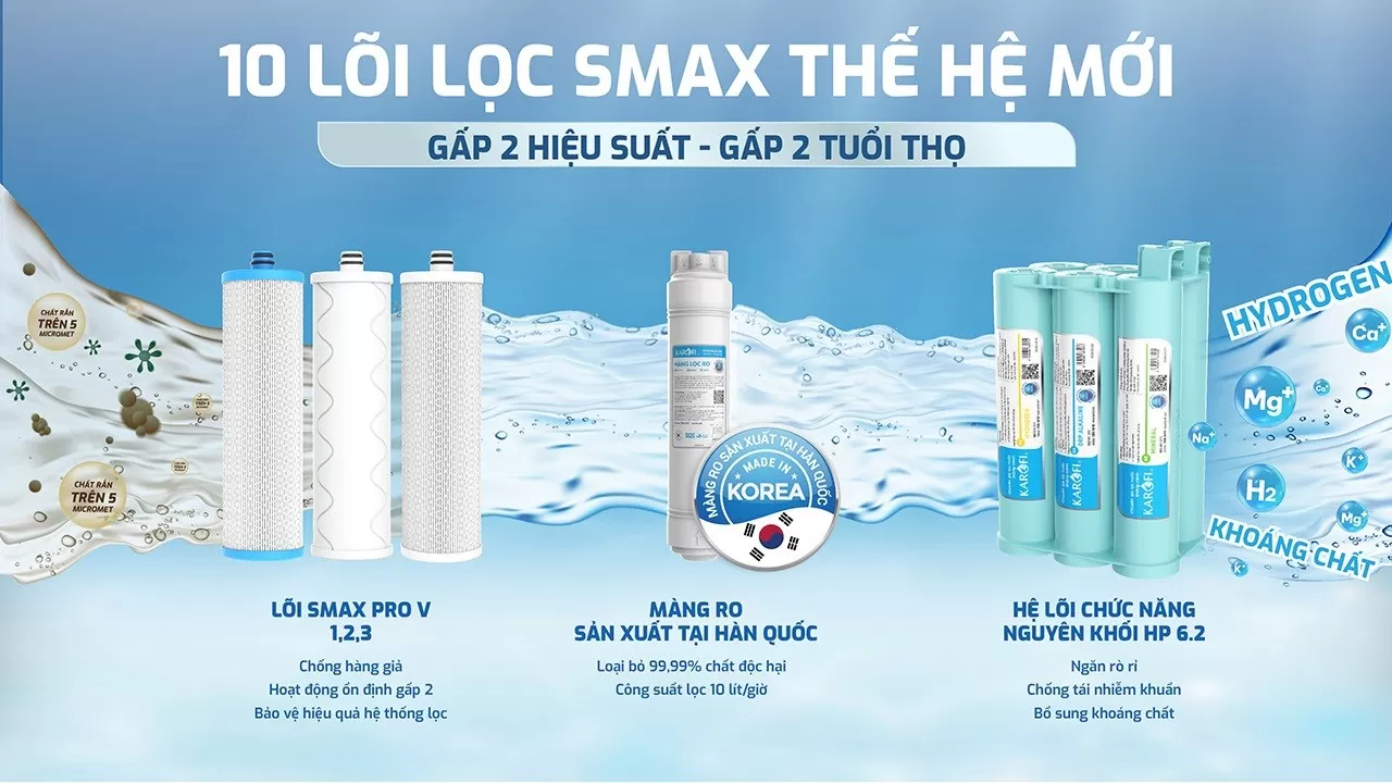 - 10 lõi lọc công nghệ Smax: gấp 2 hiệu suất, gấp 2 tuổi thọ