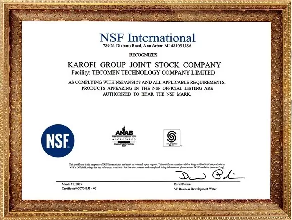 Với máy lọc nước RO Karofi, việc đạt được chứng nhận này là kết quả của sự đầu tư nghiêm túc vào nghiên cứu, phát triển và kiểm soát chất lượng. Màng RO Purifim nhập khẩu từ Mỹ - trái tim của máy - đã được sản xuất và kiểm định theo tiêu chuẩn NSF/ANSI 58, mang đến sự an tâm tuyệt đối cho người dùng.