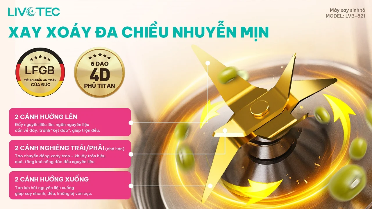 - Chất liệu dao xay inox 304 đạt chứng nhận LFGB của Đức