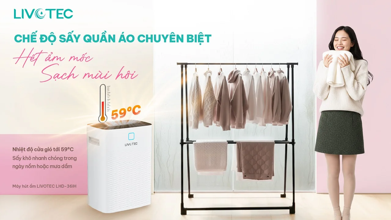- Chế độ sấy quần áo chuyên biệt – Nhiệt độ cửa gió lên đến 59°C