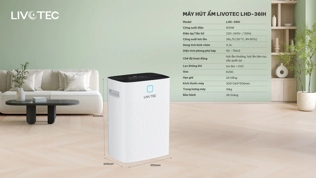 - Hút ẩm nhanh gấp 1,3 lần – Công suất hút 36L/ngày, phù hợp không gian 50-70 m²