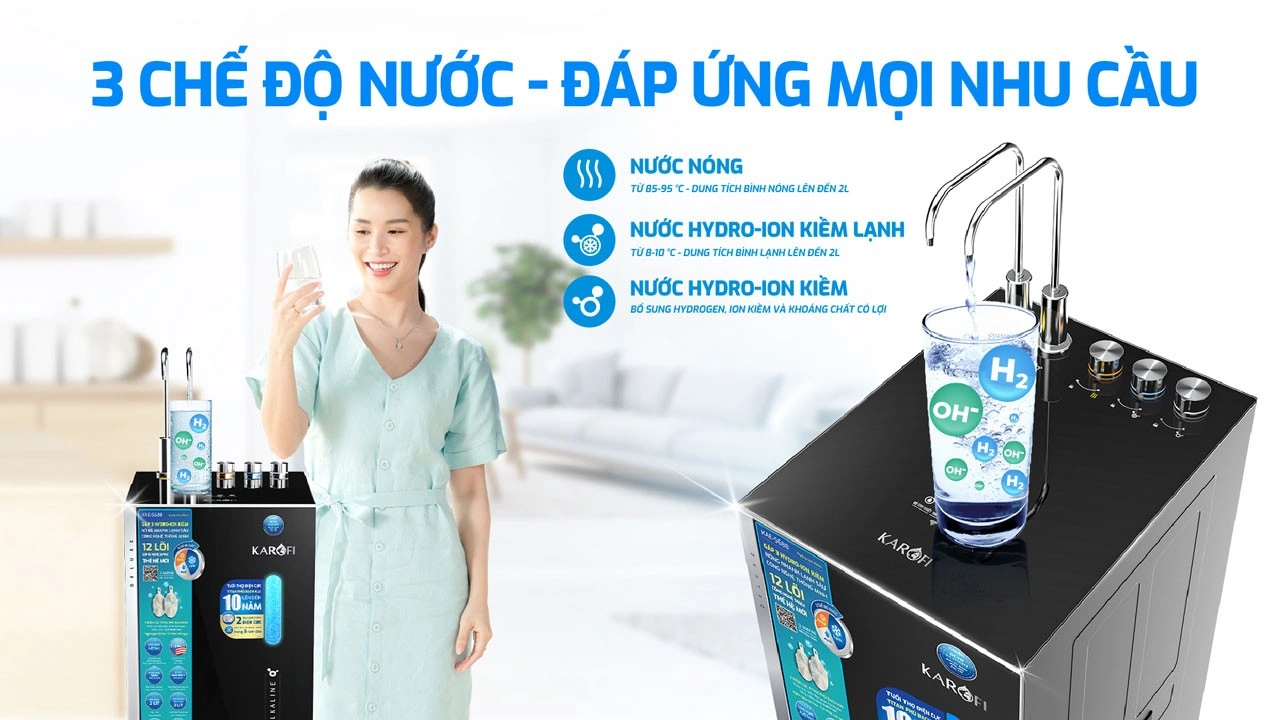 - 3 chế độ nước: Hydro-ion kiềm có trong cả nước lạnh - Nước nóng nhanh