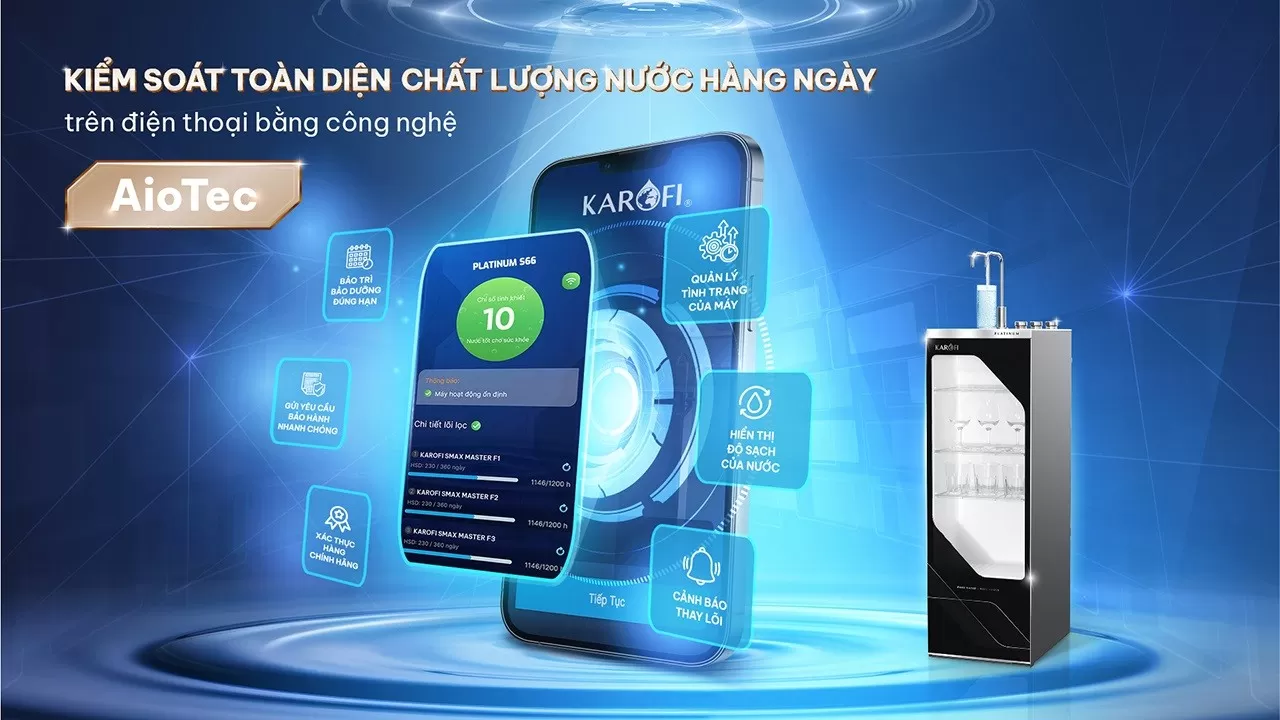 - Công nghệ AioTec thông minh: hiển thị độ sạch của nước, cảnh báo thay lõi, quản lý tình trạng của máy,...trên điện thoại qua ứng dụng Karofi 365