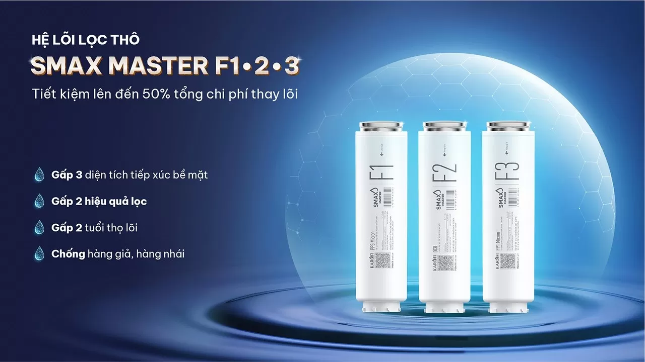 - 3 lõi lọc thô Smax Master F1-2-3: gấp 3 diện tích tiếp xúc, gấp 2 hiệu quả lọc